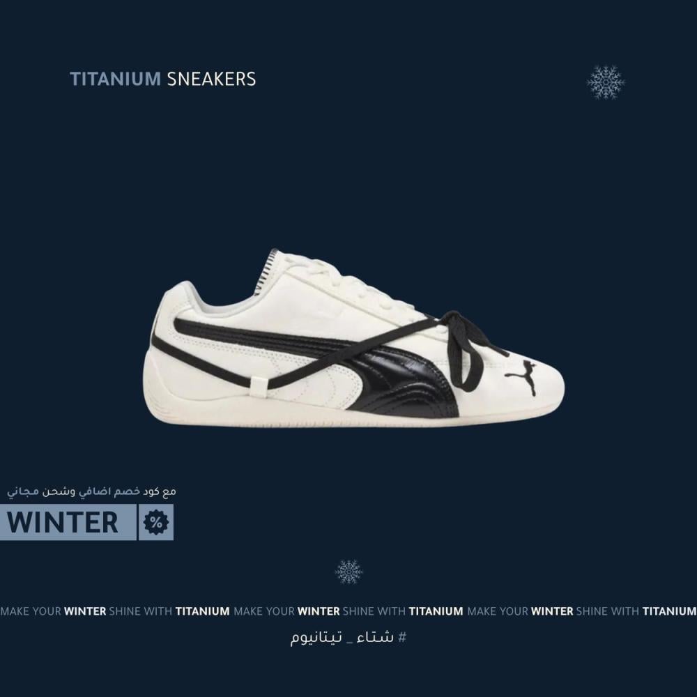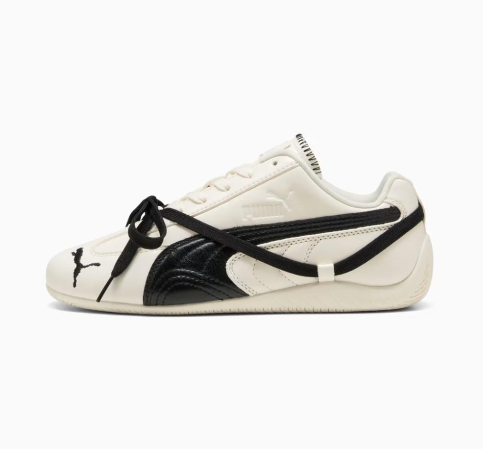 حذاء رياضي أنيق من بوما (PUMA) بتصميم يجمع بين الطابع الكلاسيكي واللمسة العصرية. يتميز الحذاء بلون كريمي فاخر يغطي الجزء العلوي، مع تفاصيل جانبية بلون أسود أنيق تمنحه تباينًا جذابًا. يظهر شعار بوما المطرّز باللون الأسود على مقدمة الحذاء، بالإضافة إلى شعار بارز على اللسان.